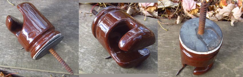 Up for sale is a real oddity that seems to turn up exclusively here in Canada, and within the country almost only here within S.W. Ontario. These Slater-made "No Tie" lag screw pieces are found on rare occasion around this area. The first example I had ever had the chance to own surfaced a year ago from a small lineman's collection I picked up. The second, third and fourth all originated from a yard sale this summer. Very unusual pieces, and apparently not widespread or common in their use. Dimensions are: 3 1/2" tall (porcelain body), by 2 7/8" wide. The lag screw protrudes an additional 2 3/8", for a total length of 5 7/8" long. This piece is made from dry process porcelain, with a heavy, clunky boddy and chunky no-tie "arms" protruding from its top. It has a recessed-embossed "S" in a diamond shape on one side (signifying Slater), with the name SLATER stamped into the metal washer that threads onto the lag screw on its base. It has a circumferential groove around the outer part of the body, but I assume the only groove designed to be used for line wire tying would be the one with the no tie projections. I know lag screw insulators aren't exactly the most desirable style that exists, but man is this thing ever cool! If you're into no-ties, lag screws or just weird-looking insulator styles, this piece is for you! This example is seemingly mint condition, save for a bit of wire rubbing in the wire groove area. There is a black gunk of some sort, perhaps rubber, on some of the high points around the outer edges of the wire groove area. I expect this could be cleaned off with acetone or a mild abrasive cleaner like barkeeper's friend. You may have trouble finding another! I accept PayPal, or personal cheque from any member of ICON or any collector with whom I have dealt before. Please feel free to contact me with any questions or for more photos, and look through my other items or unsold sales stock to combine shipping on items. |