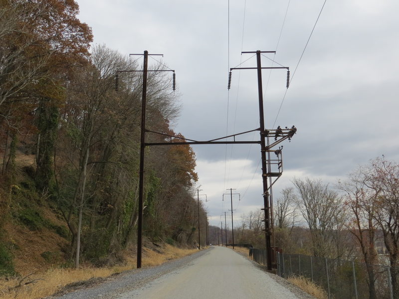 I was bored last weekend and figured I would go for an insulator hunt. I was going to a spot I frequent regularly at a substation that is in the middle of a nature preserve. To make a long story short, I found a connecting trail that connects the nature preserve to the PRR's old Atglen Susquehanna Branch, an old low grade freight route that was abandoned and is now a rail trail. What you are looking at is the old rail line running south toward the trestle at Safe Harbor. The line was electrified by the PRR in 1938, but the wires came down in the mid 80s, shortly after Conrail stopped their electric freight operations. The 138kv line on the right is still used however by Amtrak to provide power to their keystone line. |