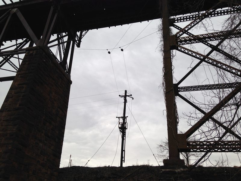 This is kind of neat. Here is the old 6.9kv signal circuit for the Port Deposit branch strung on insulators suspended between the trestle columns.