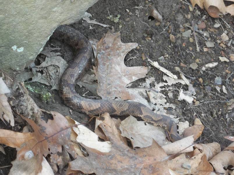 This pit viper was basking in the sun on a warm January day.
