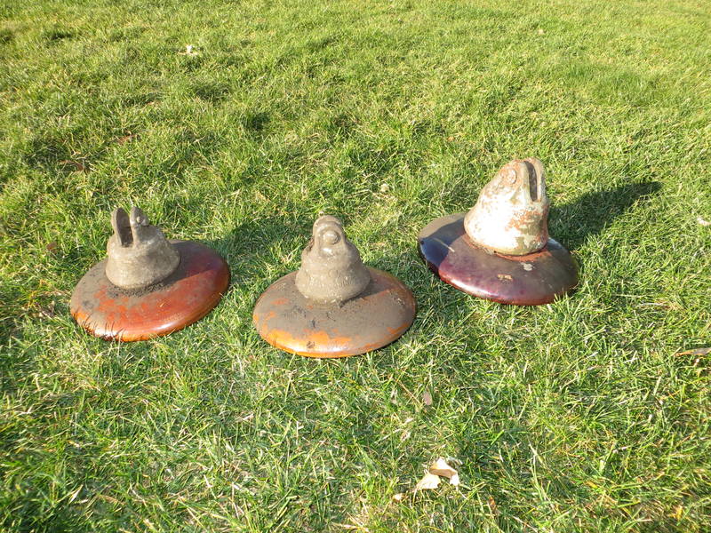 Last Saturday I took advantage of the 60 degree weather (that is unusually warm for PA this time of year) and went back out to the trestle at Safe Harbor. I looked in a spot I missed the other times I went and found these. The two smaller suspensions are Ohio Brass and the big one is a Locke high tension bell from a catenary wire dead end. There were 3 in the string, with this being the only one that wasn't smashed. |