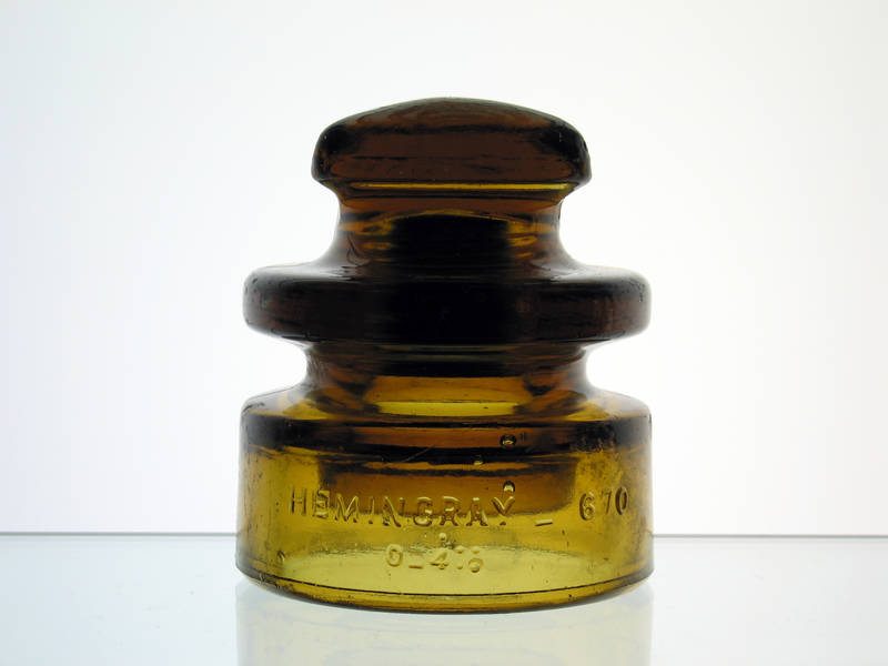 CD 220 Hemingray-670 in honey amber. New [082] listing for the 2015 price guide. This has the brass bushing embedded in the threads. Appears to be a dump specimen. In pretty good shape with typical roughess and fisheyes. Only one chip to mention: a small flake on the rear base and associated 1" bruise and 1.5" crack up the skirt. Priced accordingly well below book value at $160 shipped and insured. Payment methods accepted: PayPal friends & family ("no fee" option) or personal check. If paying by personal check, funds must clear first before insulator ships. Thanks! |