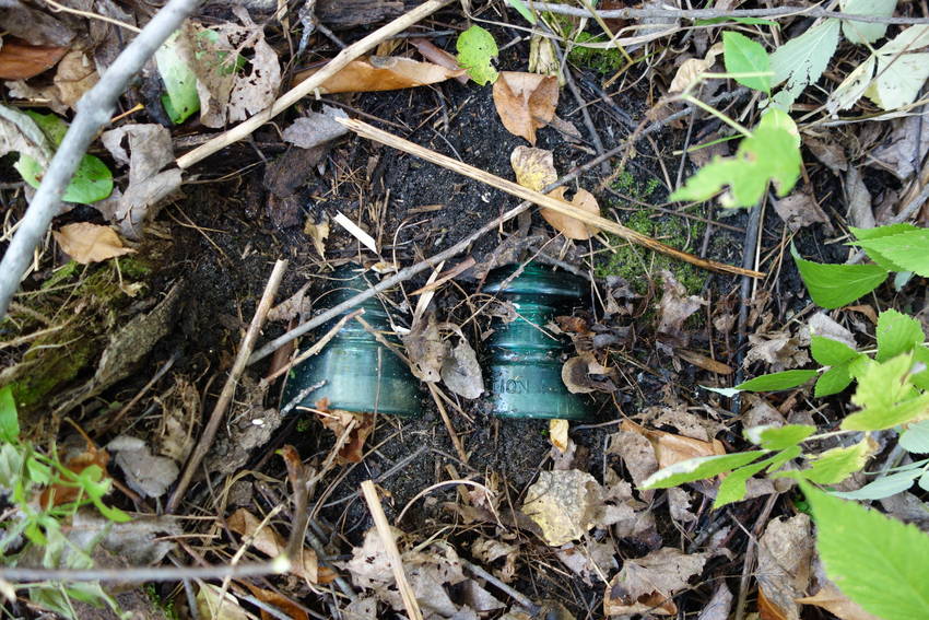 While I sit here, bored in the midst of yet another Canadian winter, I lament the warmer days of the year past. I managed to get out for a number of hunts last year, and I thought it was about time I posted at least a couple from one of them. A friend of mine and I spent a day in the autumn tracing the route of an old overland line, in the hopes of finding some glass left in the woods years before. This line was abandoned probably some 70 years ago, judging by the lack of ROW visible anywhere we checked it. It seemed to be untouched, at least in placed, as the occasional piece of glass was spotted poking up through the loamy soil in the woods at the next much-anticipated pole site. I still don't have much experience with hunting phone circuits, so when a 1678 and a Brookfield-made No. 2 Transposition were suddenly showing side-by-side as though someone had placed them there for me, I was a little excited to say the least! I haven't seen too many of the older transpositions in the wild, so this was a welcome sight! I wonder if there are any [id=493329023;more out here]? |