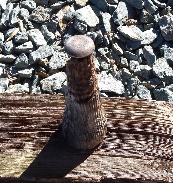 Reinforced wood pin with a Fred Locke marking ... a new discovery: these were sold at the same time as Fred's porcelain pin base pins . this is the first I have seen of these with a Fred Locke marked bolt . The marking on the bolt head reads " LOCKE PAT'S " |