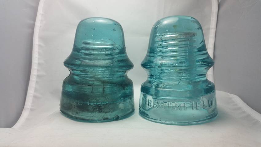Here are a couple of signals I picked up in the past couple of weeks. Not sure if they are both CD 162s or the one on the right is a 162.3. One on the right is a nice light aqua, with a slender amber streak from the top of the dome to the wire guide. I couldn't get the dirt completely off of the one on the left, but if you look closely you can see that the embossing looks hand written, and it looks likes it's been redone over older embossing. The color is sort of an odd steel aqua. Jack is going to yell at me for buying common insulators..... |
