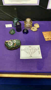 Went to a local gem show on Saturday. Interesting display for faceting glass. The person uses insulator glass to make faceted glass. The insulators here are a CD 102 BTC of Can in purple, a CD 106 Hemingray in aqua and a CD 164 Dominion in straw. The dome piece in purple is interesting.A CD 102 No Name Canada [010] with backwards 2 on dome. Great use for an insulator |