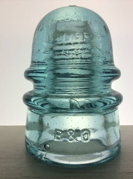 Here is another Washington antique store find. It is a CD 136 B&O (Baltimore and Ohio) made by Brookfield in light aqua. It is in perfect condition, has a "4" on the crown, and has a nice little milk streak. I had been wanting one of these for a long time, and was exited to find one in an antique store. My excitement decreased when I saw the $80 price tag, but when I called the owner and told them what it was worth, I got a much more reasonable deal on it. |