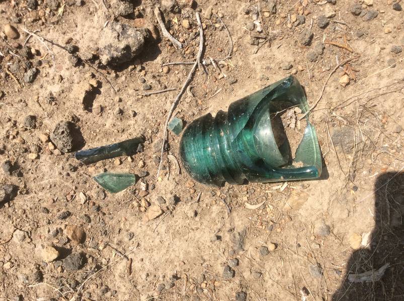 A few years ago, I was visiting Northern California and decided to go on an insulator hunt. The older line was dismantled, and there were no poles remaining, but there were a few insulators lying around. Here is a Hemingray made no name CD 147 spiral groove that I found. Even though they are common, I always keep the ones that I find. On this hunt, I found several spiral grooves (this being the most intact) and some CD 162 H.G.Co.s, one of which had some small amber streaks. For a long time, all the broken pieces sat in a cardboard box in my backyard until I finally decided to clean up the pieces, assemble them (the shattered pieces from 10 or so different insulators were mixed up), and glue them. I ended up with some decent specimens. |