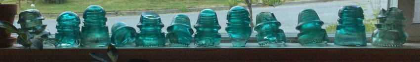 These are all of the insulators that I found on an insulator hunt in Northern California a few years ago after I reglued all of them. There are CD 147 aqua No Name Hemingray spiral grooves, aqua CD 162 H.G.Co.s, and sage green CD 154 McLaughlin 42s. They are all broken, but they are very interesting and historical. |