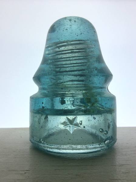 I got this one about three or four years ago when I only had about 50 or 60 insulators and no price guide. It is a unique Star CD 133 in light blue. It is stuffed with snow and bubbles, has a small amber swirl, and the base is a distorted oval rather than the usual perfect circle base. I got this at a local garage sale for two dollars along with an aqua star keg, and a porcelain keg. It remains one of my favorite insulators. |