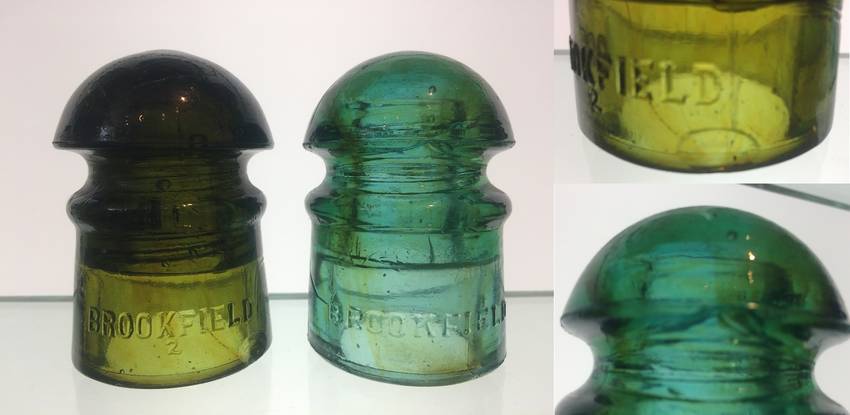 Two Brookfield CD 101's Olive green, #2 under Brookfield, SB. pinky nail chip under " D ", one fleabite on dome. Aqua with amber streaks. Two chips on upper wire ridge plus a small open bubble with small chip on the upper wire ridge as well. $110 USD shipped USA and Canada Too expensive ? I don't collect these, you tell me what they are worth ? I will split them but shipping cost to me wont change so there is no upside to you on that. |