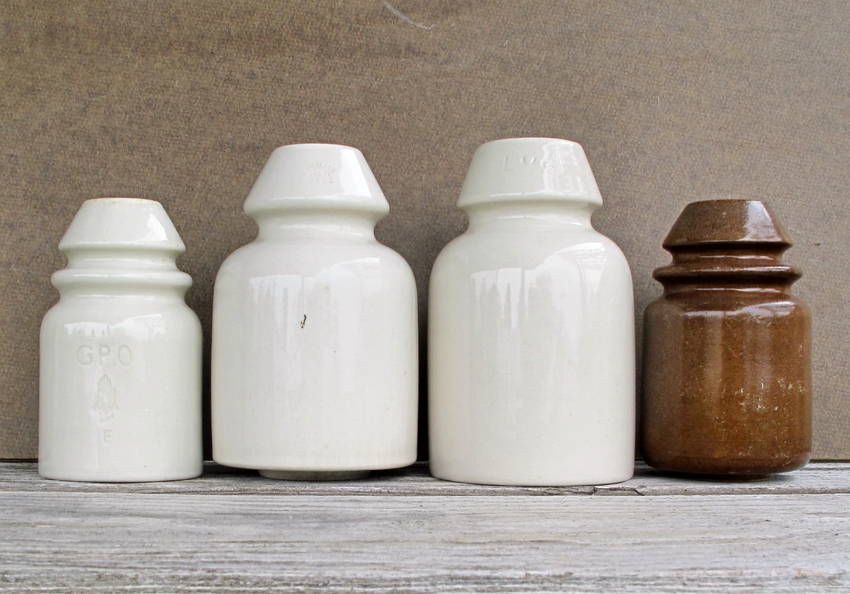 The left insulator has a hand logo and G.P.O. (General Post Office) incised on it. I believe it is from Ireland. Has a recessed inner skirt. Next insulator is British, incised with the logo of Gaskell and Grocett. On the top it is marked 3/63. Has an extended inner skirt. Next insulator in incised L.M.S. on the crown and with some detailed markings on the unglazed top. This insulator has a recessed inner skirt. The last insulator (brown glaze) is marked G.P.O. on the top and has an extended inner skirt. All are undamaged in excellent condition. The threaded pinholes are a small size and will not fit an American sized pin. Asking $20 for all four. These are heavy but that doesn't matter since they will all be shipped together in a flat rate Priority Mail box for $13.60. Grand total $33.60. PayPal works best but will accept other forms or payment. |