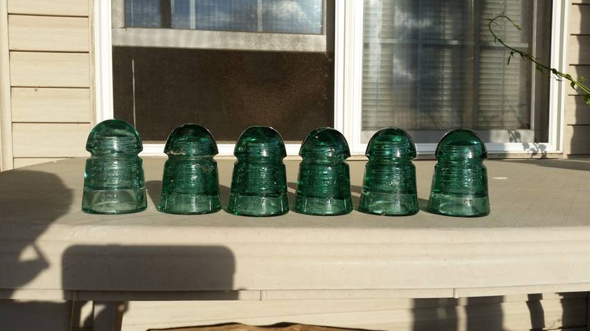 The antique store [id=500587496] owner's son happened to be in the store and said he had a bunch of insulators that were left in his house by the previous owner. He invited us over to his house and we bought a milk crate full of insulators from him. Most had some damage to them, but here are half a dozen green ones EIN [010] I think. |