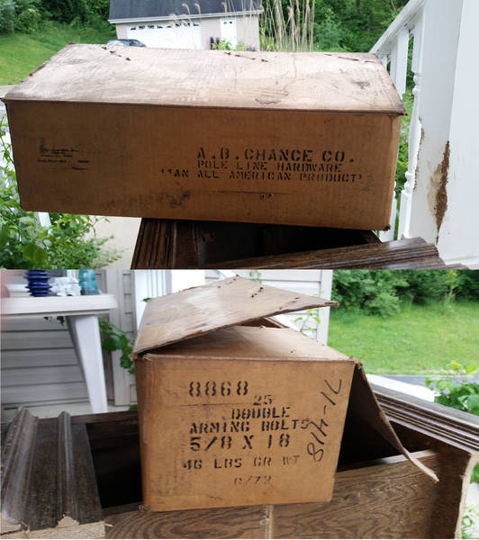 After winning one of the insulator lots at the auction today, we discovered that the box was a sturdy, lined, waxed cardboard box from A. B. Chance, marked as Pole Line Hardware. Pretty neat that the box is insulator related too.