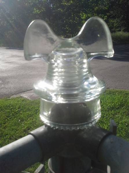 Here's a nice CD 257 Mickey in what looks like clear, but when put up against a real clear it looks to have a ice blue tint. It's perfect except for one tiny not even pinky nail size flake on the center ridge. Nice insulator in a nice color. $20 plus shipping. |