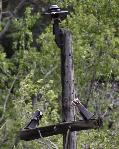 This final picture gives you a good view of the insulator pieces remaining on the two pins on the crossarm. The pin on the right clearly has the top of the bottom skirt still on it, and no sign of threads. The one on the left has a shell of the second skirt and the top of the bottom skirt. It would be interesting to see if any broken pieces remain at the bottom of the pole. The first photo is here [id=504922245]. |