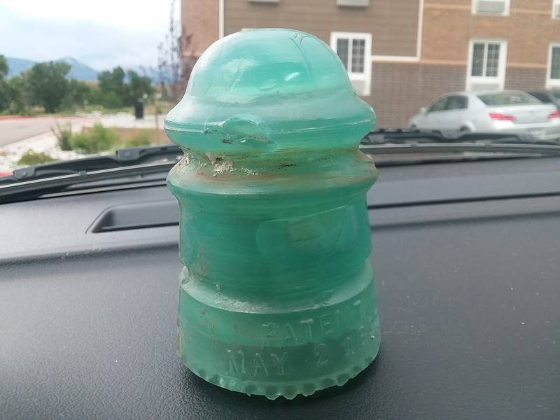 While exploring Colorado Springs, prior to the National, I headed over to Garden of the Gods. While leaving, just outside of the park, there was an unmanned garage sale with a bucket, with a sign that read, "Donate for what you take." There was a table of insulators, all commons, except for this Jade Hemingray 12. Notice too, the large bubbles just below the wire groove. There is some damage on the bottom, but not a bad find, considering it was just by happenstance! |