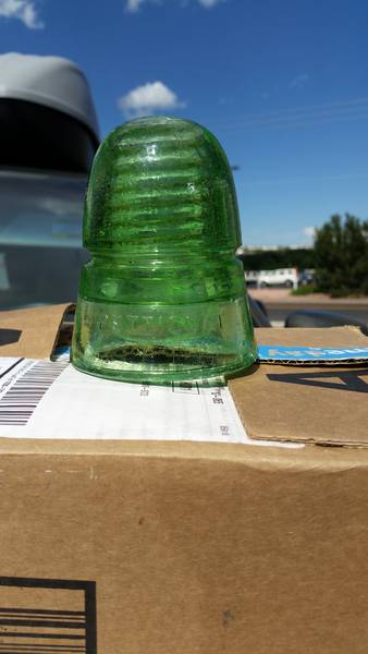 I bought this H.G. Co. Petticoat beehive at one of the last antique stores we stopped in before the National. When I saw it, I couldn't decide if the color was real or not... it looked almost florescent. After taking it to the National and showing it to some Hemingray specialists, they told me it was light depression glass green. Quite a surprise. It has a little chunk out of the inner skirt, but otherwise very nice. |