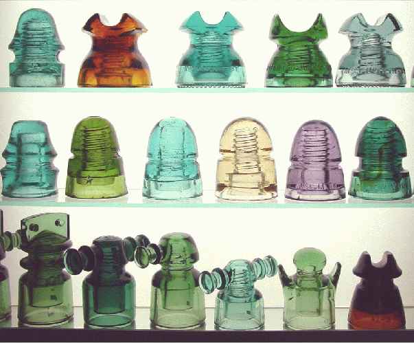 A few nice lookers at the bottom of my otherwise pony case. Top row includes a flashed amber Hemi 252 (see also [id=2104650], a snotty green and aqua Manhattan, and what's very close to a delft blue McLaughlin 252. Up close and personal, the McLaughlin actually has tiny purple swirls in its steely blue ears. The four beehives on the middle shelf represent the sum total of all the beehives in my collection. The amber-swirled Brookfield 149 came from a junk store years before I realized how special it was. A close-up of this guy can also be seen at [id=2104557]. Frenchies and other foreigners line the bottom shelf. Ironically, the gingerbread boy is one of the few insulators I've actually collected in the wild. It came from a roadside stockpile in the French Pyrenees on a (newlywed) hitchhiking tour way back in 1972. |