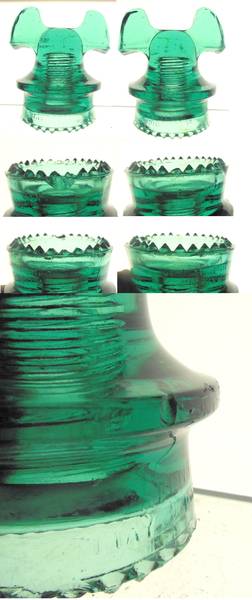 Here's a tough wide saddle other patent mouse to find. CD 257-other patent, EIN [020]. A very difficult Hemingray product to locate even at shows. 4 of the humongous drips halved, 4 drip tips partially flaked, a small skirt/base juncture chip which halves one of the 4 drips, a few base corner edge dings, a double match head sized midriff micro flake and some light and scattered ear side edge dings plus around 7 tiny pencil lead point fleabites in various places. Please use the view original tool and let me know if you want other photos. $60 + shipping. |