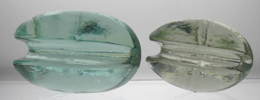 Here's a CD 1130 (3 1/8" x 2) in a tough Aqua color and a CD 1145 (2 1/2 x 1 3/4") in an Ice Green from Italy. The CD 1145 I'm offering is slightly bigger than the NIA listing. The CD 1130 has a 1 1/2" wg flake, a 1/2 index finger flake, 1/2 pinky flake, small sliver flake and 7 teeny tic marks. The CD 1145 has two 3/4" flakes and 6 teeeny tic marks. Both have factory ground pontil mark. The first email gets the CD 1130 and the CD 1145. Thanks. |