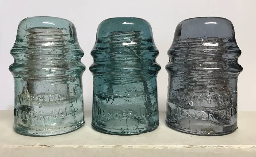 Set of three WFG Co CD 121's in different colors, Light Aqua, shade of Steel Blue, and light lavender. All are in very good condition for Denver tolls and display well. The light aqua one has some light annealing cracks in dome, the blue one does have an annealing crack above the WFG on the wire groove and a wire groove rub on the rear skirt. It also has some burst air bubbles on the base, they are not chips. The light lavender one is VNM with only a small peck on the side of the dome. The threaded pinhole on this one is off center and tilited to the left. I'm asking $85 shipped for the set of three. Would consider selling each one individually as well. More info and pics can be sent on request. |
