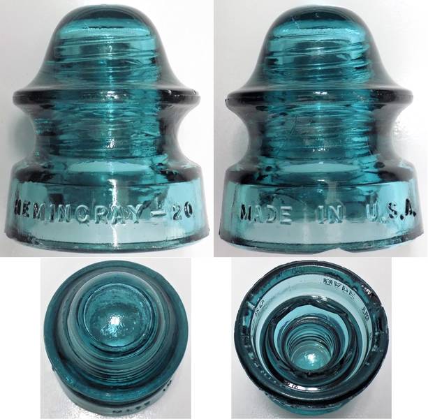 Here is less common a CD 164 EIN [050] (F-Skirt) HEMINGRAY-20 (R-Skirt) MADE IN U.S.A. SB in a bluish aqua. This one displays well, as show, but it has some condition issues. Besides a few scattered pecks around the upper wire ridge and crown, there is a shallow sliver off the rear base, a tiny fleck off the front skirt below M, and some nibbling around the sharp base edge. But the real issue is extensive chipping of the inner skirt. So this is a fairly good looking placeholder until a better one comes along. Asking just $5 plus postage. Withdrawn. |