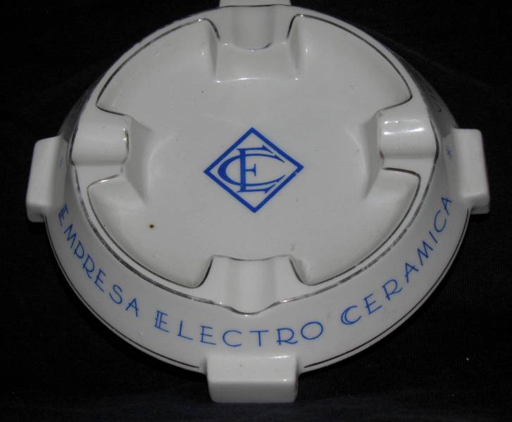Here's a 6 inch porcelain ashtray advertising Electro Ceramica- makers of fine insulators from Portugal. Stamped with EC CANDAL on base- which is the insulator division for the company. No cracks or chips, with some minor fading of gold trim. $100 plus shipping to the first email. Thanks! |