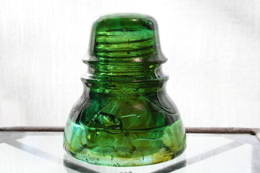This insulator has a lot of stuff in it: white fire brick in the dome, three globs of snot and a finger tip size skirt bubble . Damage consists of 6 small bruises to the inside of the skirt and a couple more to the inside of the petticoat. I never noticed the damage in the 10 years or so that I had this.