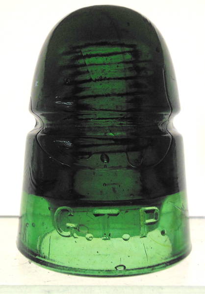 Extremely dark emerald GTP beehive. Glass is bordering emerald black glass in the cabinet. 2 small dome side spots where it lightly touched another insulator while hot and a tiny spot on the skirt where it touched another insulator while hot. All 4 tiny vent teats are present on the inner skirt. $75 PP. |