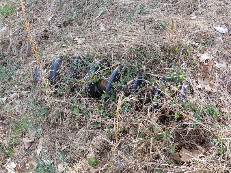 I climbed up the hill to see if I could find anything and stumbled upon these at the top of the hill. They are 1918 patent Ohio Brass bells. There was also a newer Chance suspension buried in the weeds.