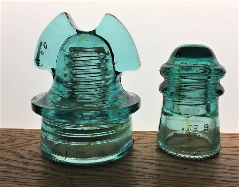 Left is a based embossed Oakman CD 259 embossed CABLE on the skirt. It has an amber/milky worm that runs from the dome down to the skirt where it pools around. Right is a Hemingray No. 9 with an amber streak from dome to skirt. Normally I don't bother with the No. 9's until I hung around Kim Borgman for too long. |
