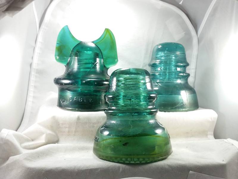 The CD 258 was in the same online auction as the purple WT [id=535158706] and the glass cylinder [id=535158919]. Very nice amber in the ears, and no real damage other than an open bubble or two. Both CD 152s were from antique stores in Richmond VA. The one has a huge amber swath going around the skirt (and a very distinctive dot after "Hemingray"). The other has a bunch of steam trails in it, which you can't see very well in the picture. |