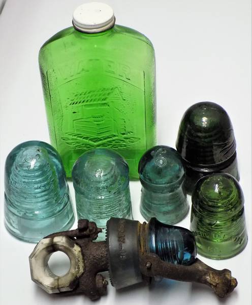 I've been fairly lucky visiting different flea markets over the last couple of weeks. Here are some finds. In back is a mint 7-Up Green water bottle embossed HEMINGRAY on the base. On the left is a CD 145 CREB (SN 06a) next to a CD 127 (SN7, otherwise unreadable embossing). In the middle is a CD 102 SKEB with a cool curlicue straw line and a lone ghost embossed B on the dome. Behind that is a CD 145 SKEB loaded with junk and snow and amber and stuff, and if there ever was such a color as Septic Enchilada, I'd put this up for the standard. On the right is a deep Yellow Green CD 104 NET&T with a backward 5 on the dome and minor flakes. But the real treasure is a virtually complete Holmes tree bracket insulator with a sooty CD 160 in Hemingray Blue that has a few drips chipped and a small flake off the wire ridge. The only real damage is the lag screw portion of the upper bracket which has snapped off. The lower bracket is intact with a wooden cob and porcelain two-part spool that shows a wire rub inside the bottom half. Inquiries welcome. |