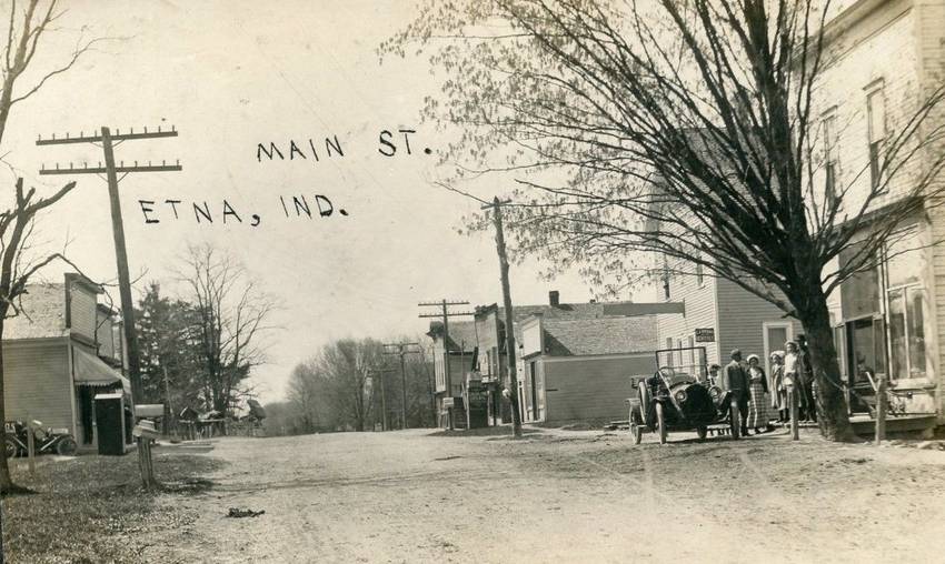 Etna, IN c.1915. Old 10-Pin Phone Openwire Line Thru Village Center.
