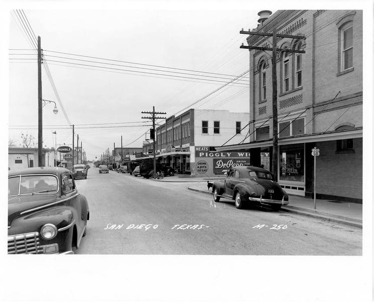 San Diego, TX, c.1948. Phone Open Wire Lines, Old Cars in Downtown