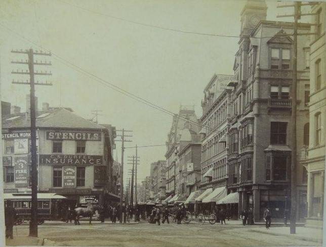 Providence, RI, 1889. Early Utility Poles, Rooftop Crossarm Structure.