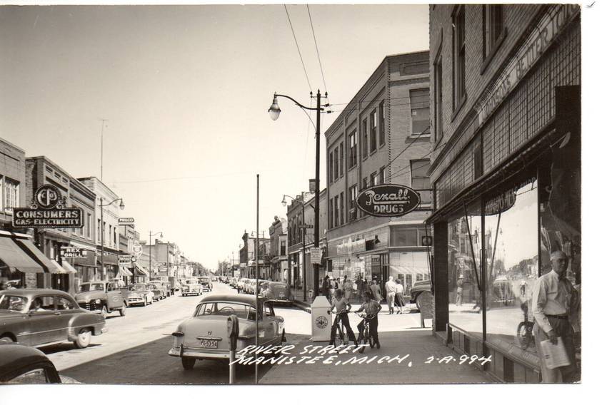 Occasionally street lighting wires through downtown business districts were underground as well. In this photo pin type insulators atop each pole support these lines on short stubby "brackets" that were either bolted onto the pole or welded as part of it. Utilities sometimes used porcelain insulators in blue, green or yellow glazes to identify such circuits. |
