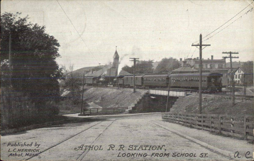 This was along a busy east-west route here in Massachusetts. Judging from the insulators found along this line in the early 1990s, it appears it was rebuilt around 1920. New poles and hard-drawn copper wire replaced all of the old plant. The only things that appeared to have been reused were some of the crossarm braces, perhaps some steel pins with wood cobs and CD 145 insulators (B-beehives). A few miles down from where this photo was taken a six-pin crossarm that had two holes in it for its diagional lag-mounting screws was located rotting away in the brush. No insulators but apparently it stayed virtually untouched for 70-or-so years. Through my many years of collecting, hiking RR right-of-ways for hundreds of miles, digging dumps, etc., I have run across very, very few old crossarms with this method of mounting arrangement in any kind of condition. No doubt New England's seasons and rather moist climate rotted most of the discarded ones long before I was born. Click "Next" for another period look of this station and this line. |