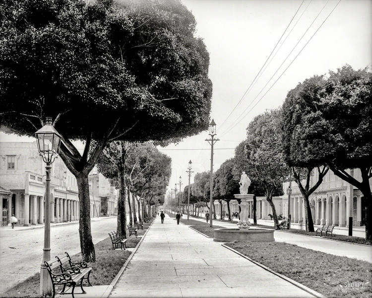 These were the first generation of electric arc lights for outdoor and street lighting. Introduced in the 1880s, these large fixtures had two opposing carbon arc rods that had to be replaced and adjusted just about on a daily basis. So, "comfortably stepped" ornate poles like the ones you see here probably made the everyday climb a little more pleasant :-). A gas light is seen on the left. |