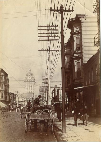 The big heavy DC cables that operated the city's trolley and cable car system were strung upon the stately metal poles and crossarms like you see in the foreground. The pole in the background likely supported telephone circuits. It appears that this light-colored, very uniform and straight pole might have been wood...or perhaps metal? |