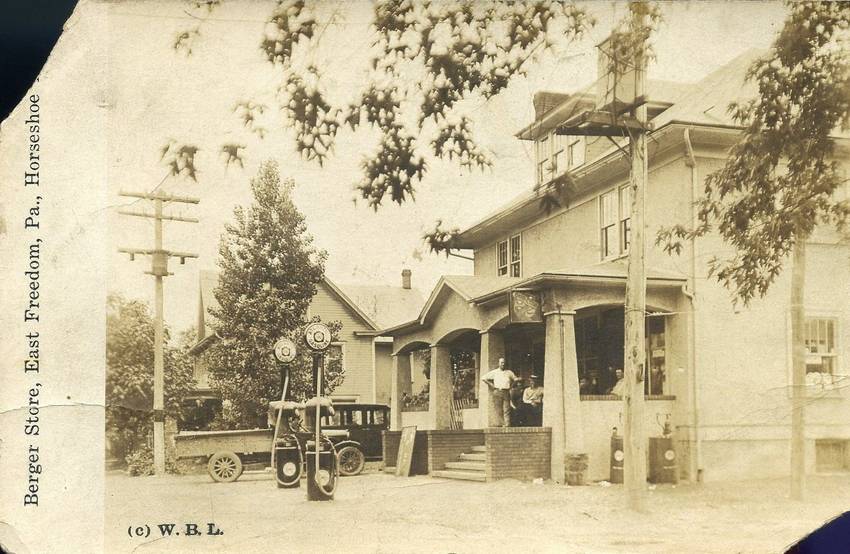 E. Freedom, PA c.1920. Utility Open Wire Lines, Pole Transformer, Old Cars, Gas Pumps