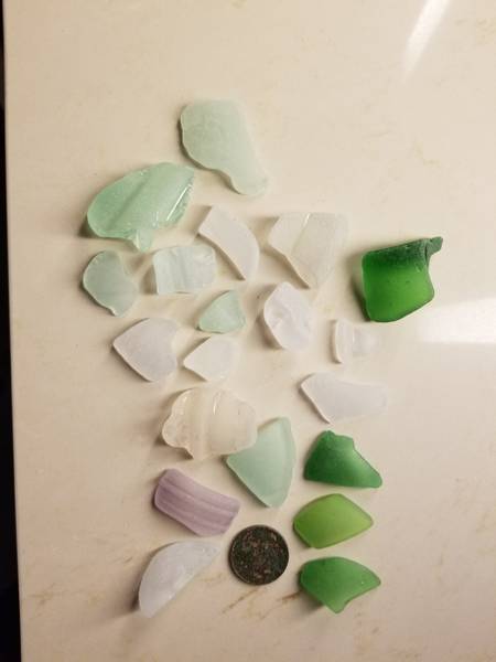 Something else I collect besides insulators is sea glass (surf tumbled glass thanks to nature's rock tumbler). I've been chasing it in the surf since 2001. It's mostly Mason jar pieces, bottle pieces or sometimes drinking glass shards. But you get other stuff too. So far I have a bottle stopper, a marble and half a glass tail light lense could be from a boat?. However, I have yet to find any insulator pieces. Someone did find a mostly whole Brookfield pony in the ocean in one of the towns I often go to hunt so I'm crossing my fingers. Wasn't in the water as much as I like as my right boot sprung a leak. But these are the best finds for this hunt. The coin was a 1990 quarter you can just make out the date. |