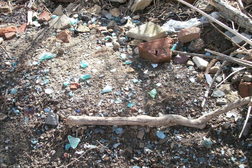 The pounding of the river and constantly shifting ground has not been kind to the glass. Much of it is has been pulverized into dime sized pieces or smaller. Larger chunks of scrap glass are rarely larger than a baseball. Glass from the plants earliest days is mixed in with the 9 and 12 shards from the last restart attempts at production after drip points were patented to supplement demand on the Muncie plant for telephone pony types. All this is mixed with rocks, bricks, debris, trash and lots and lots of mud. |