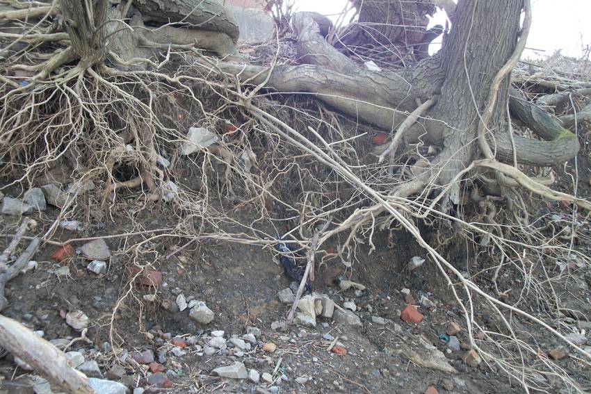 I can remember years ago when these trees were mostly on solid ground. The dirt has been eroded out from under the roots by the river flooding. Good for exposing shards, bad for the river bank. Pictures of some glass finds to come.....