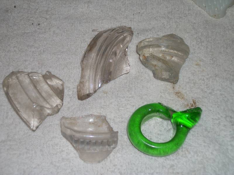 Always fun to find lamp shards. The one at center bottom I believe is a "Cooper" base. I have found dozens of clear loopy applied handles but this I believe is the first green one.