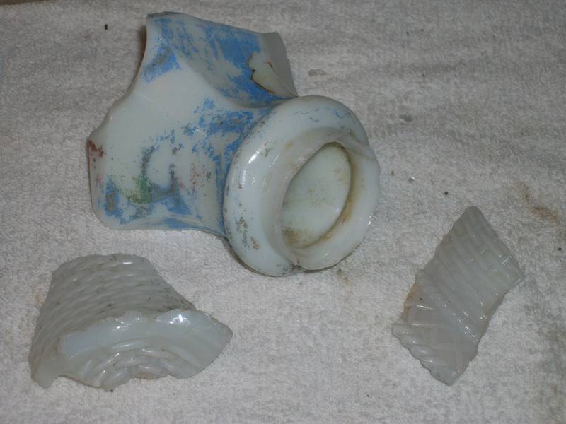 A chunk of a painted syrup pitcher. Something must have gone wrong after it was painted and fired. Those woven basket pieces have been turning up for years.