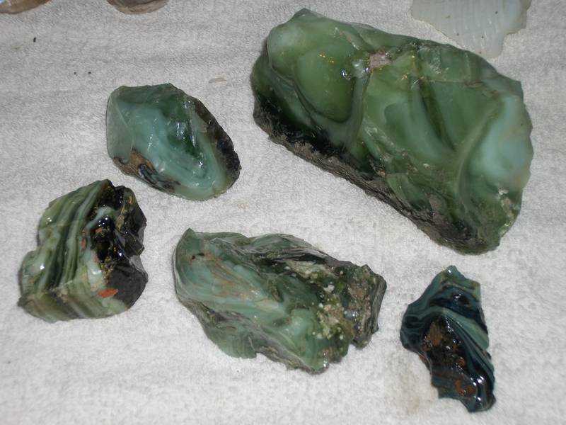Just can't pass these up. These seem to be mixed to achieve various shades of jade milk glass for opaque glassware. sometimes they are solid jade colored while others have a mix swirled together. The largest piece here is the size of a potato.
