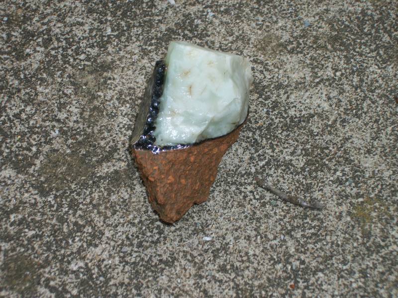 Or junk with glass? This odd chunk has a lump of white milk surrounded by a thin layer of dark olive green fused to a hunk of brick. Pieces of brick attached to shards is common.