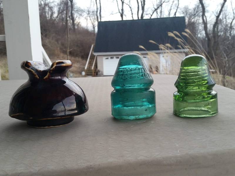 Took the long way home from the New Oxford show last weekend. Stopped at some small town antique stores and found these interesting pieces. The porcelain one looks like a U-659 but has a different crown than what Elton shows in his guide, and is exceptionally crude for a PP. There is a glazed over chunk missing from the bottom of the skirt and there are dark vertical streaks all around the skirt. And some nice light highlights on the crown. The aqua CD 132 Pat Dec 19 1871 has a weird extended skirt, a glass dot at the top of the pinhole, and is scuffed on the top of the dome and on the upper and lower wire guide ridges as if it had been rolled against something and scratched up. The last piece is a nice yellow olive green Star CD 133. |